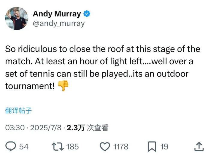 第二盘结束后,温网组委会突然宣布天色已晚关闭顶棚打开夜灯,为比赛提供照明。但是这件事却引起了迪米特洛夫的强烈不满,当时就和温网赛事官员理论起来。