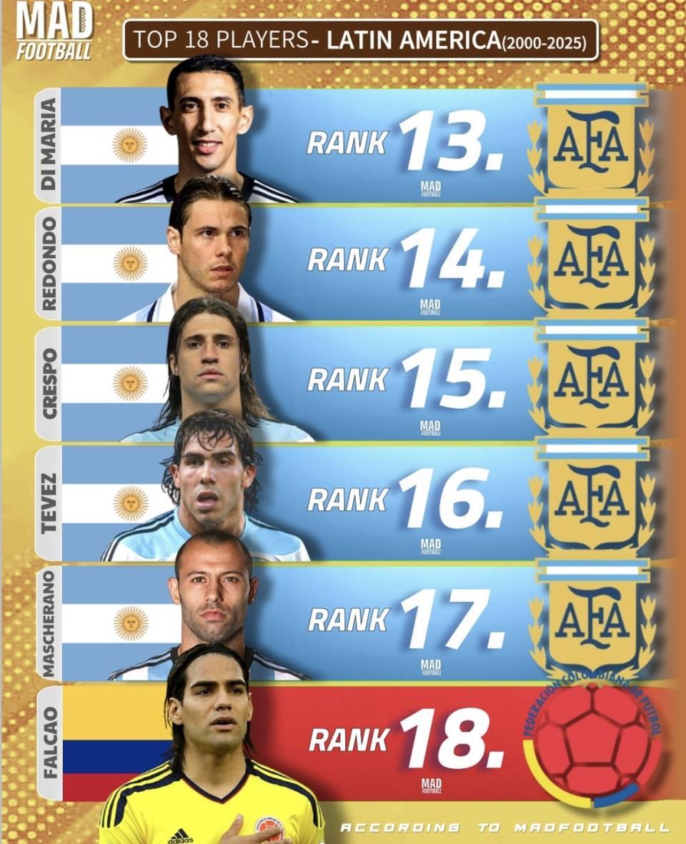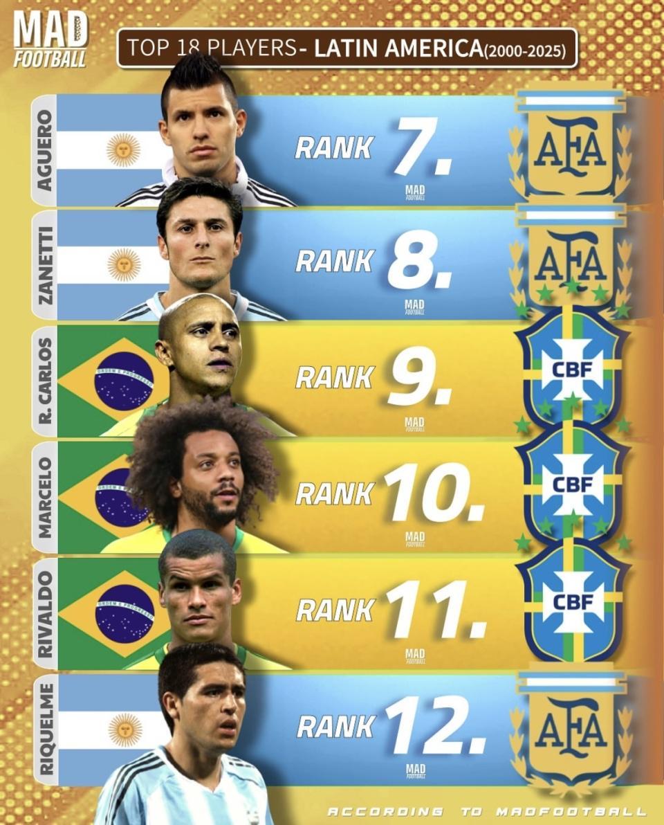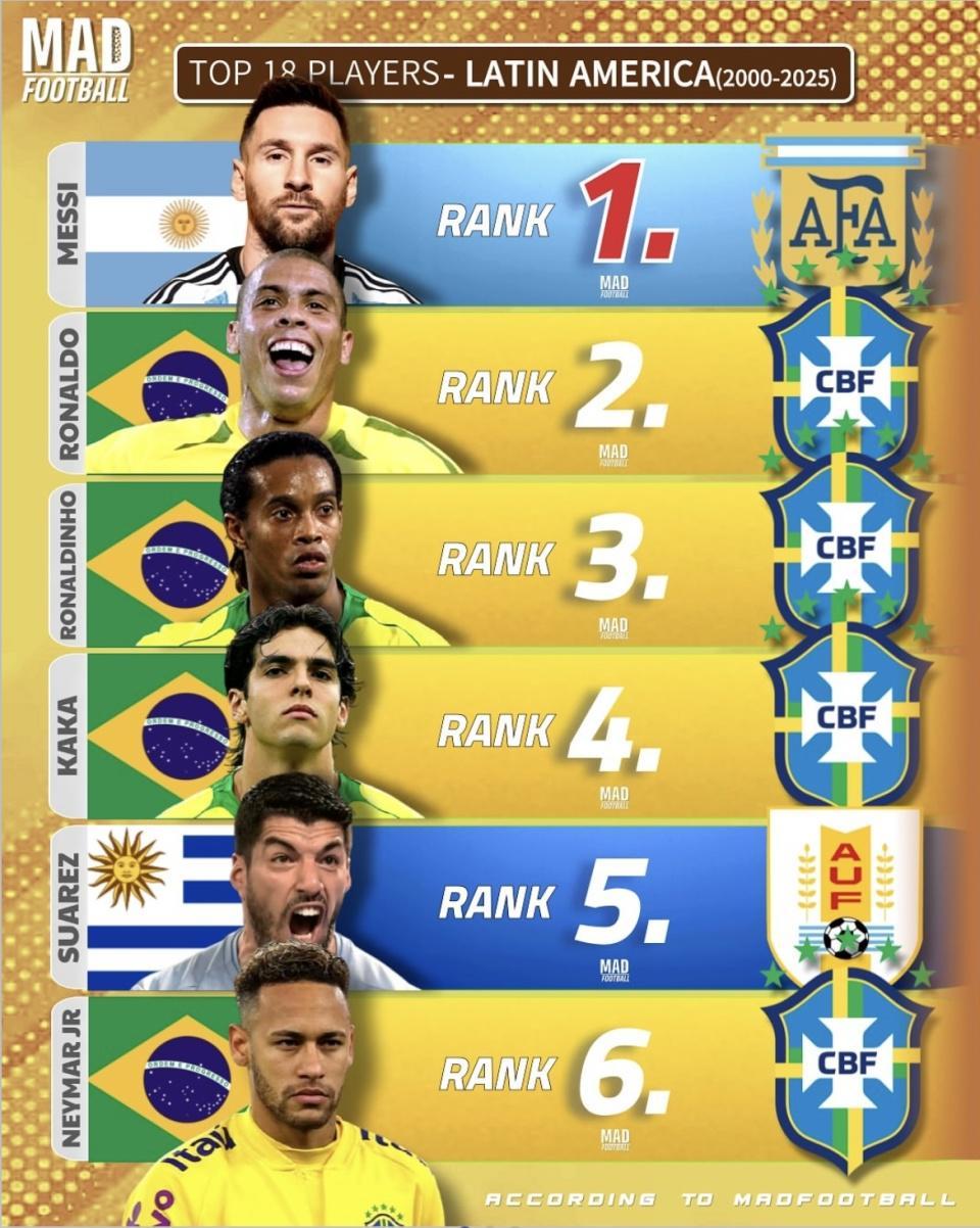 近日,足球数据媒体 MAD FOOTBALL 发布了《2000—2025年拉丁美洲最佳18名球员榜单》。这份榜单涵盖了过去25年最具影响力的南美球星,从梅西到罗纳尔多,从苏亚雷斯到内马尔,几乎囊括了球迷耳熟能详的名字。榜单一经发布,立刻在球迷圈引发了讨论和争议。
